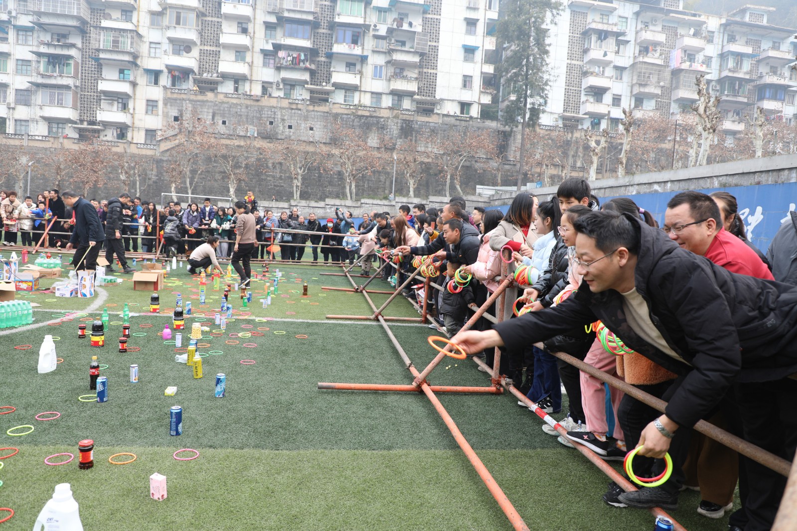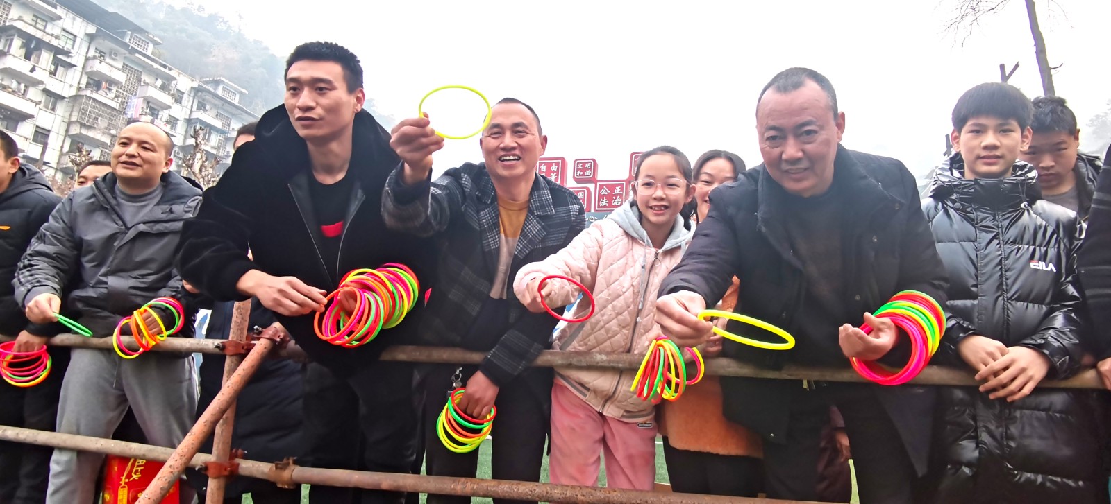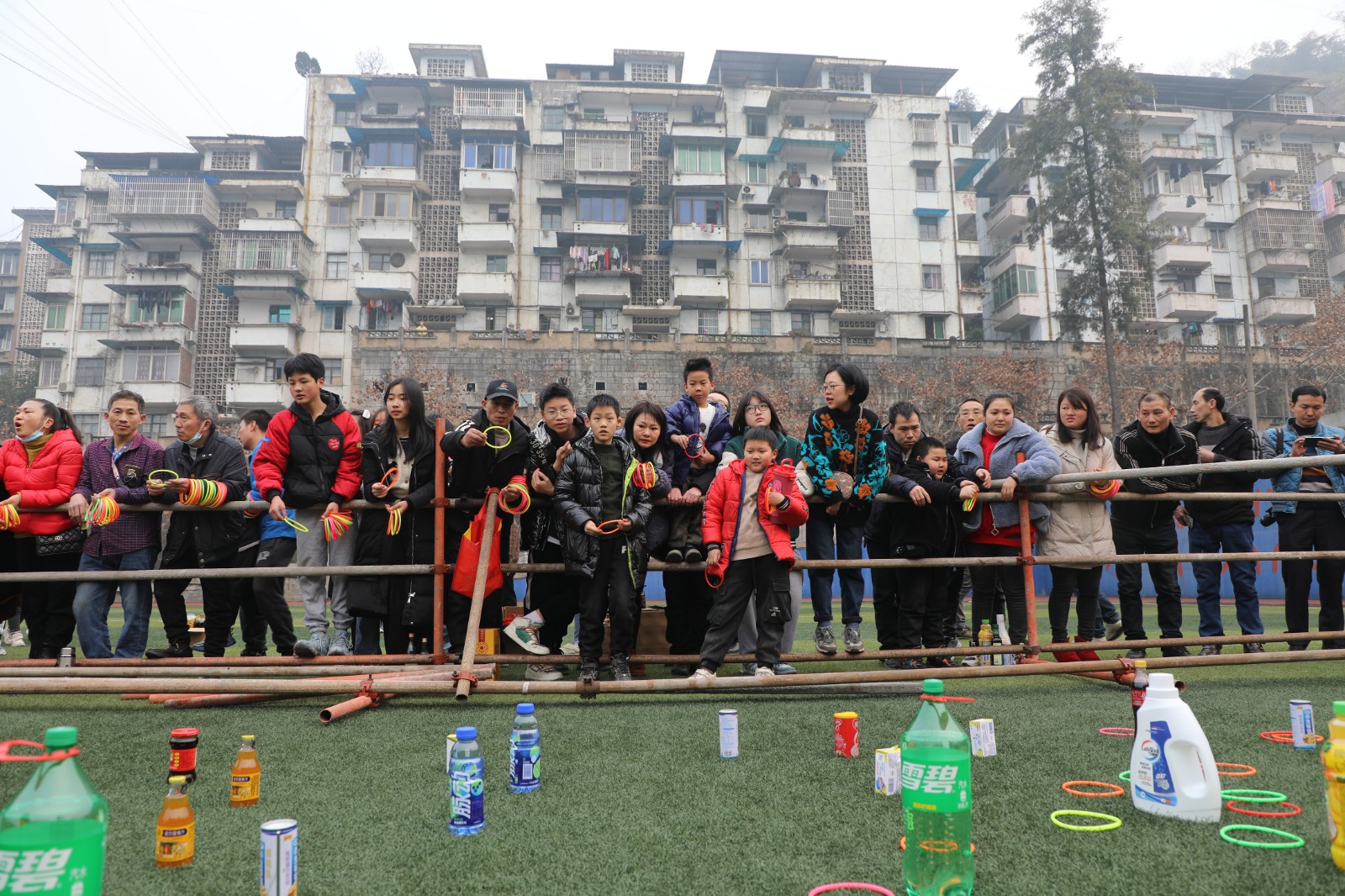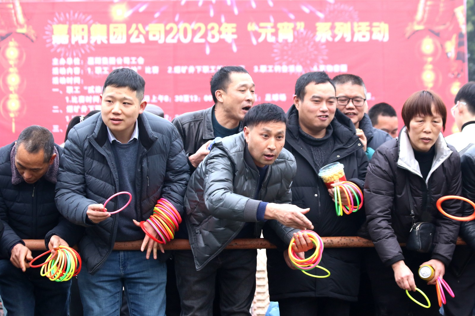 “实物套圈”与“贰柒拾”争霸在官斗山足球场同步进行,职工们携妻带子来到矿区“碰运气”。长方形的活动现场围了个里三层外三层,等待“出击”的家属们,在彩圈售卖处排起的长龙绕了两道弯。凝神聚气、预估距离,屏住呼吸、瞄准目标,转动手腕、用力一挥,天空中快速闪过一道道美丽的抛物线。有套中目标丰收喜悦的欢呼,有擦肩而过的叹息与加油。套上三两瓶好酒,回家过个热闹年,无论老少,眼里都是希望。