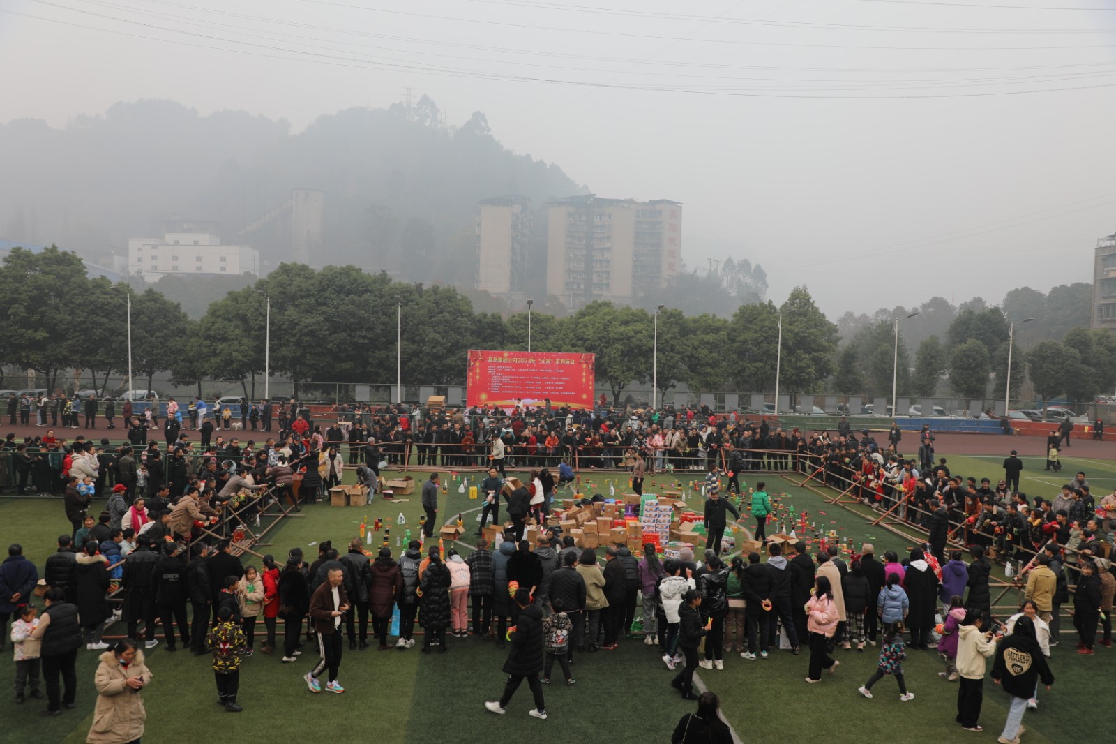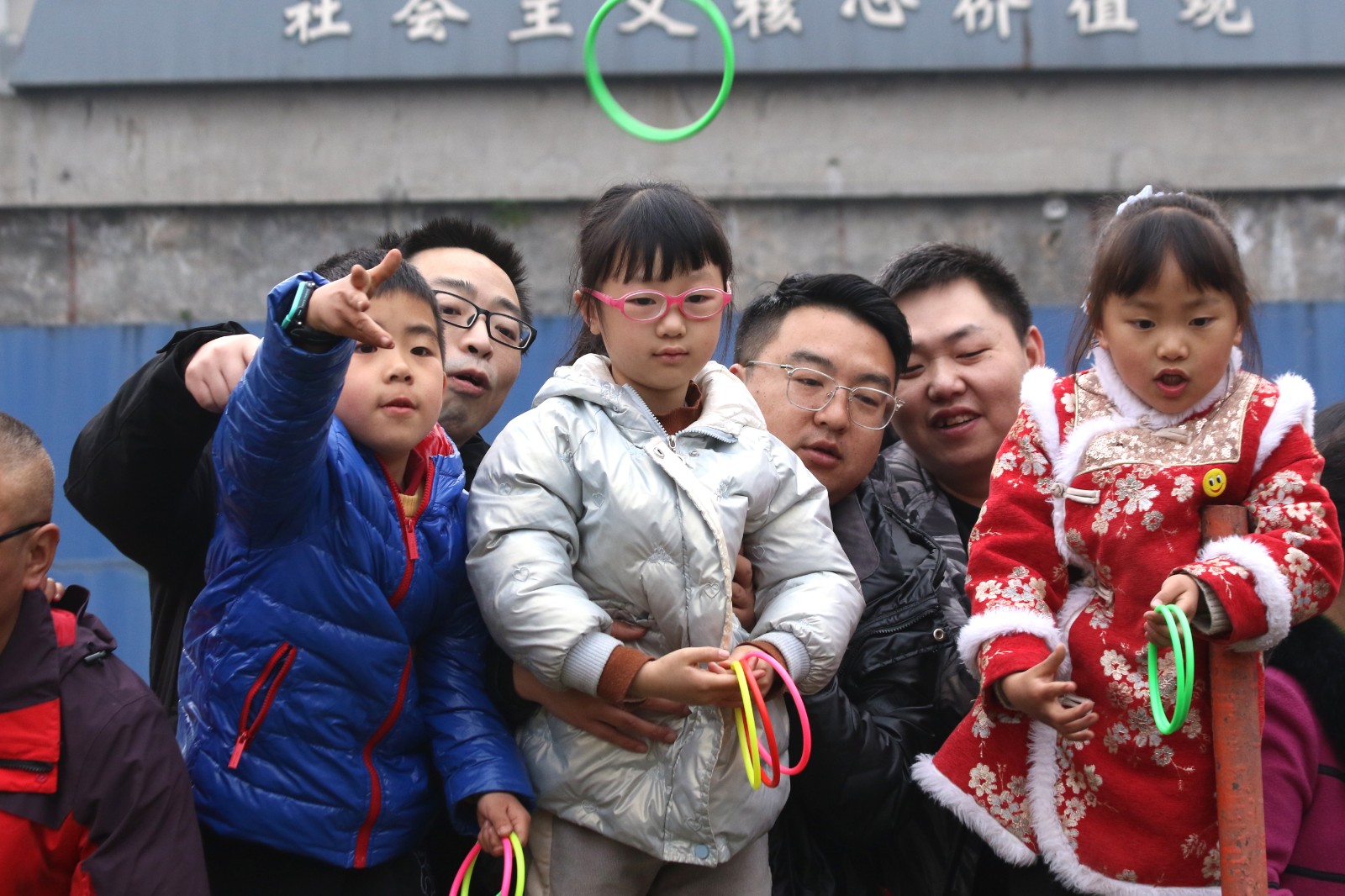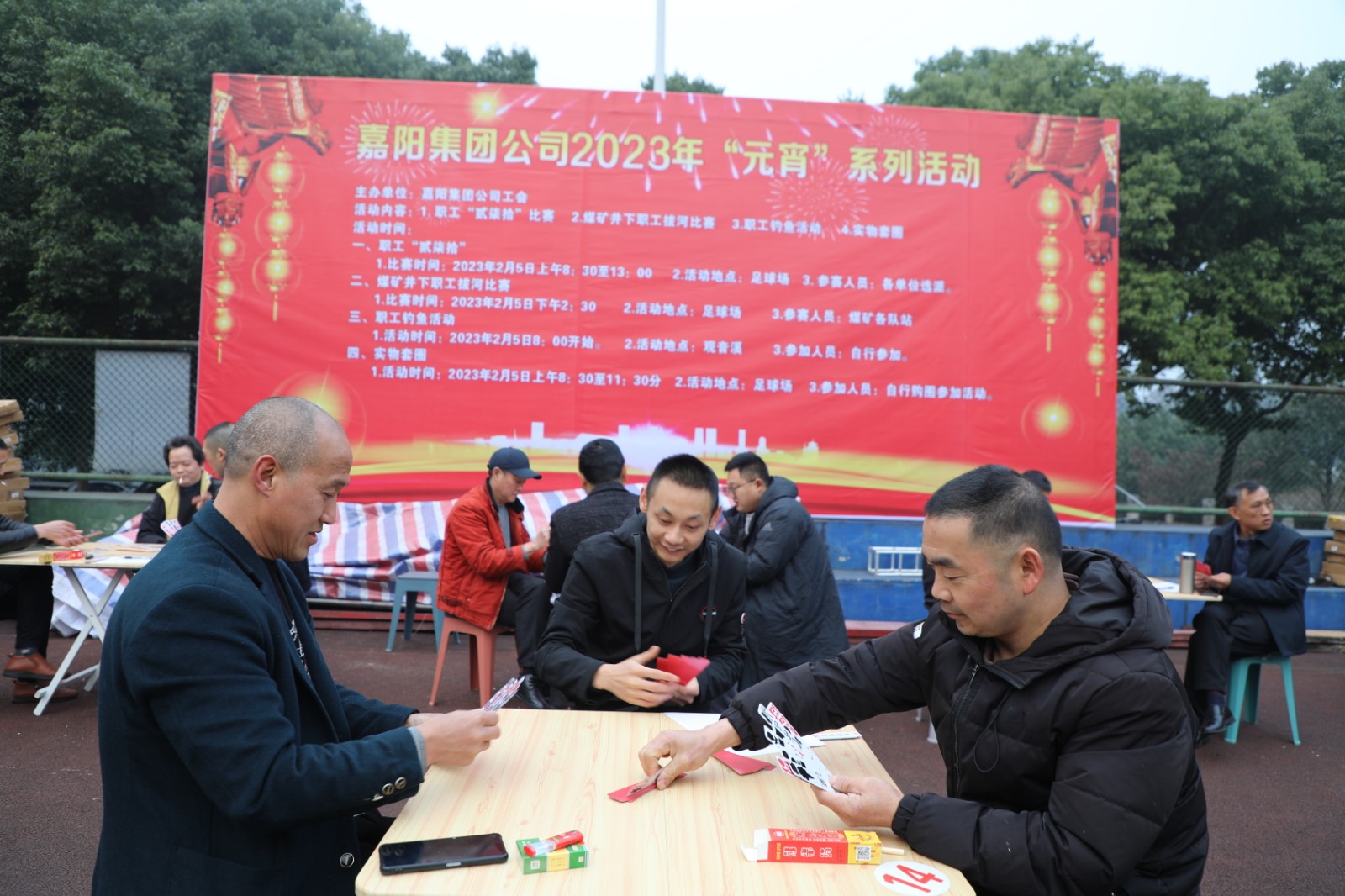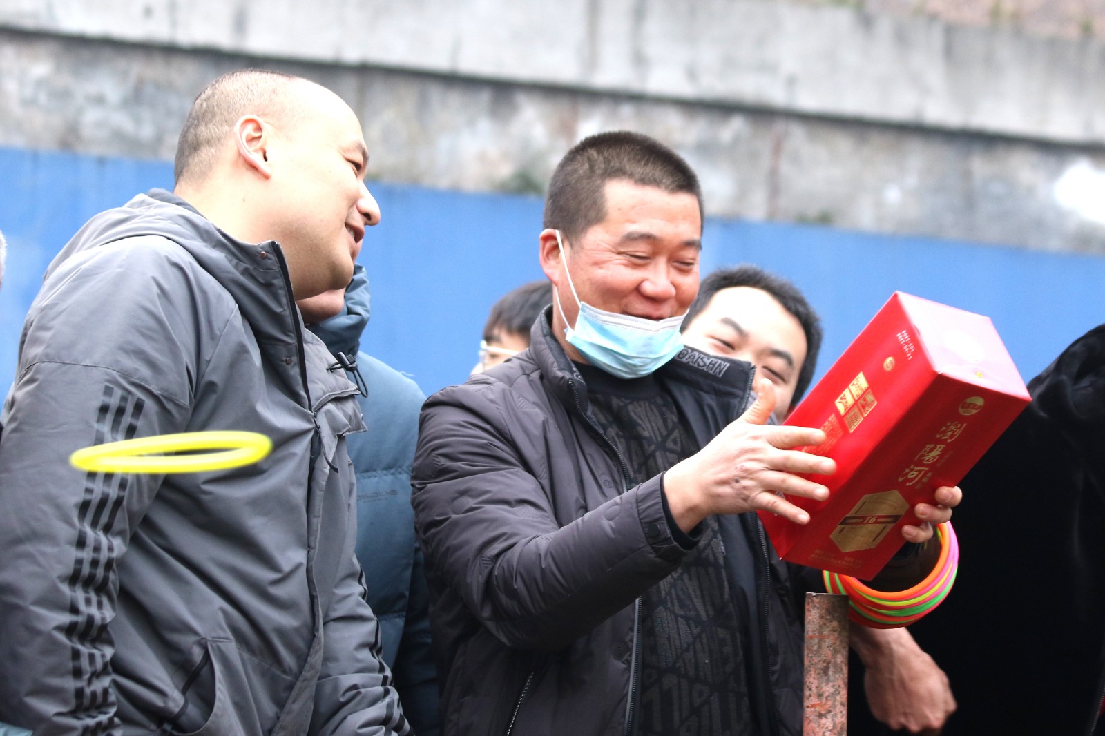 “实物套圈”与“贰柒拾”争霸在官斗山足球场同步进行,职工们携妻带子来到矿区“碰运气”。长方形的活动现场围了个里三层外三层,等待“出击”的家属们,在彩圈售卖处排起的长龙绕了两道弯。凝神聚气、预估距离,屏住呼吸、瞄准目标,转动手腕、用力一挥,天空中快速闪过一道道美丽的抛物线。有套中目标丰收喜悦的欢呼,有擦肩而过的叹息与加油。套上三两瓶好酒,回家过个热闹年,无论老少,眼里都是希望。