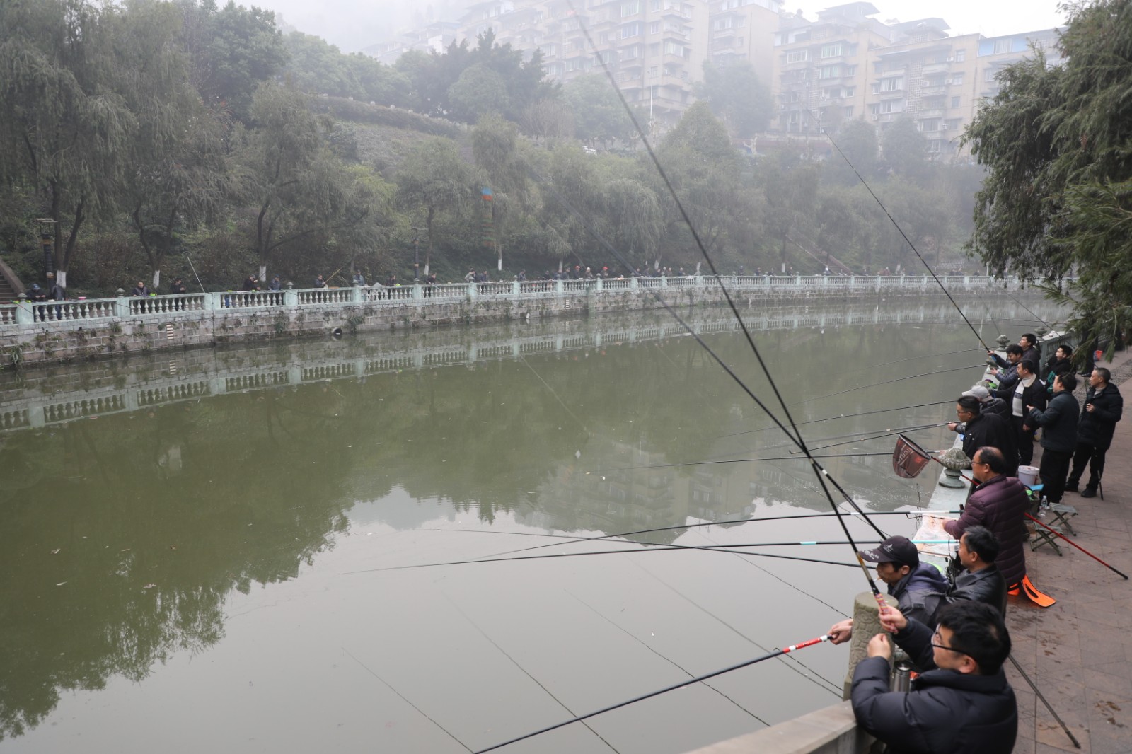 一年一度的元宵活动,寓意美好的年年有“鱼”必不可少,与往年不同的是,今年的钓鱼活动不再指派选手比赛,职工们都可以参加。早上8点,天色尚未完全清明,钓鱼爱好者们就齐聚在春风拂柳的观音溪两岸,人手一杆,错落排列。系线、拴钩、挂饵、抛竿,动作娴熟一气呵成;不一会儿,前两天刚补进溪里的大鲤鱼、小鲫鱼就啄食上钩了;提竿、溜鱼,收线,拉网,垂钓者收获满满,欢天喜地。技术高的属于“教授讲课”,钓上个七八斤不成问题,运气差点没关系,反正一天时间还长,有的是机会。
