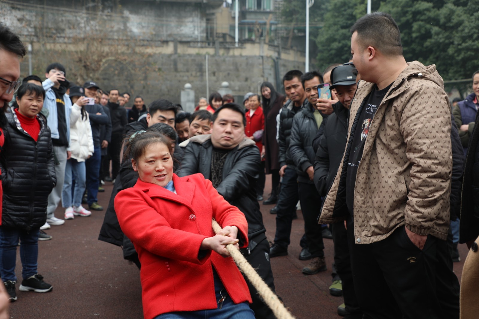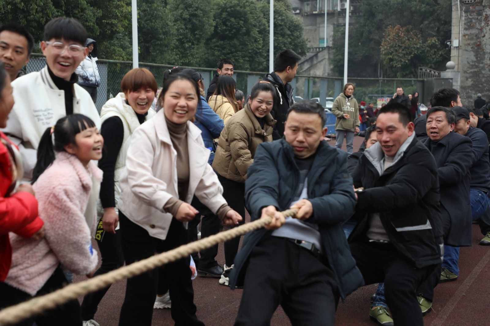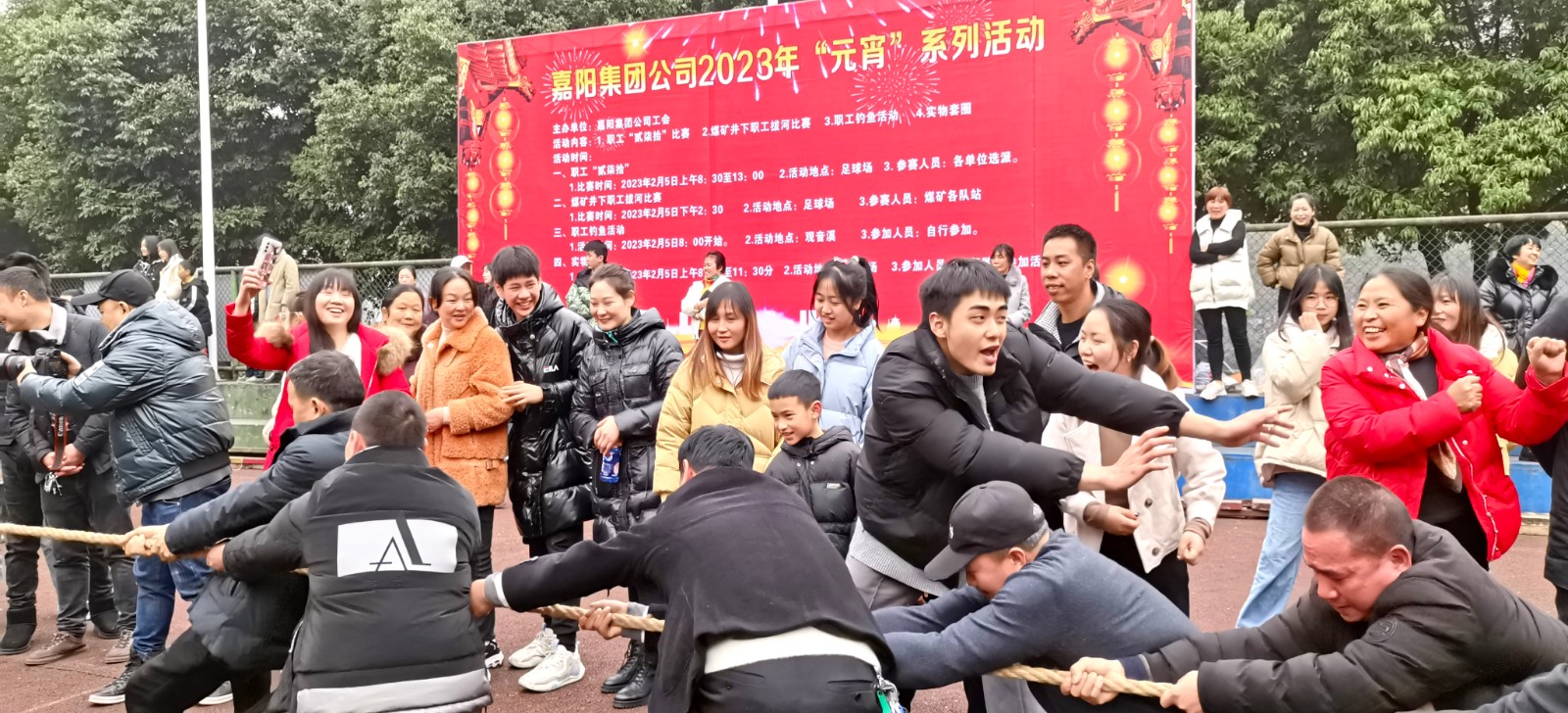 下午2点钟,矿工拔河赛开赛。清点人数、排好距离,抓紧绳子、身体尽力往后仰;在急促的哨声中,绷直的绳子着上了力,选手们铆足力气往后拉;“一二、一二”节奏不断,“加油、加油”此起彼伏;实力悬殊留回味,久久相持是看点,在这欢乐的节日里,大人们拼力气定胜负一笑泯恩仇,孩子们嬉戏打闹凑热闹,一派祥和。