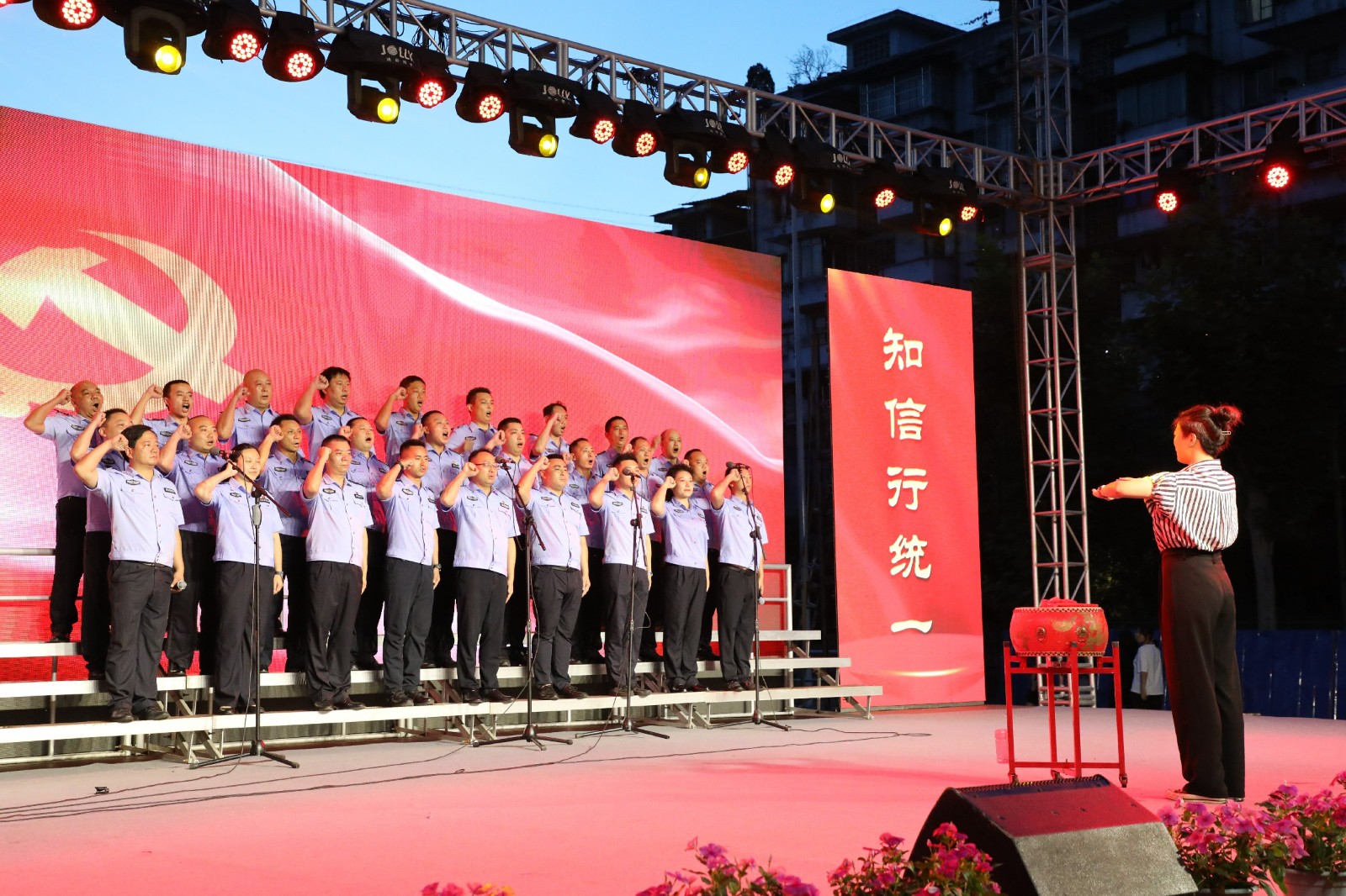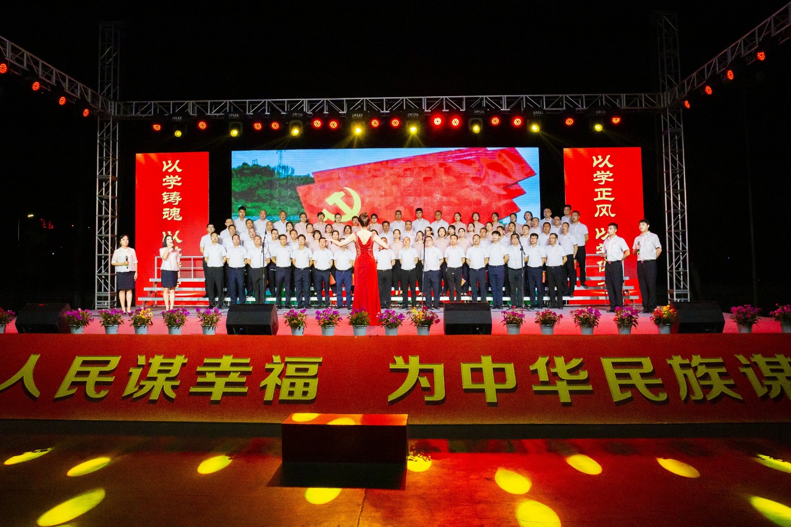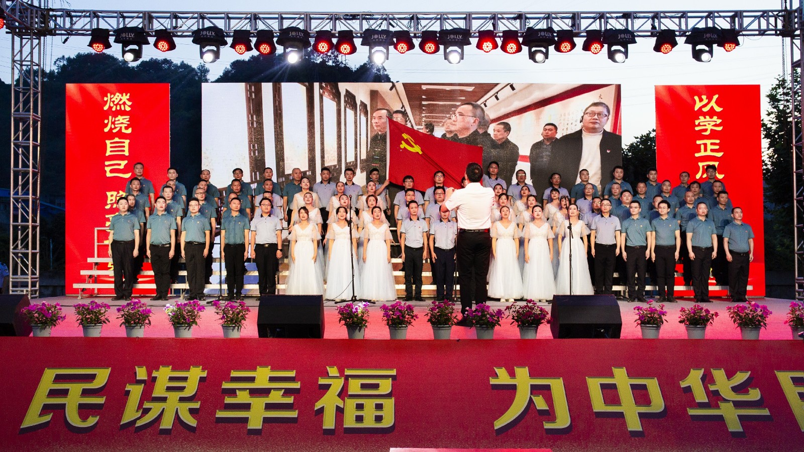演出在一曲《祖国不会忘记》中拉开帷幕,2个多小时的演出中,公司领导班子成员分别与机关和二级单位职工合唱了十余首歌曲,《领航》讴歌了伟大的中国共产党带领人民昂首挺立在新时代的征程上,走向幸福走向复兴;《请党放心 强国有我》提振新时代建设者的信心与力量,要不负时代,不负韶华,不负党和人民的殷切期望;《国家》表达了深厚的家国情怀;《人民江山》将人民至上的理念展现得淋漓尽致,是民心所向,伟业所须;《党旗飘扬的方向》抒发了每一位党员坚定的信仰,向着胜利,冲锋在前,开创未来……歌声时而雄壮豪迈,时而柔情满怀,深情表达了当代矿工永远跟党走的心声和坚定决心。公司党委结对联建单位川投大健康也受邀带来了歌曲《灯火里的中国》,驻矿单位犍为县芭石煤炭独立工矿区医院合唱了《我和我的祖国》。
