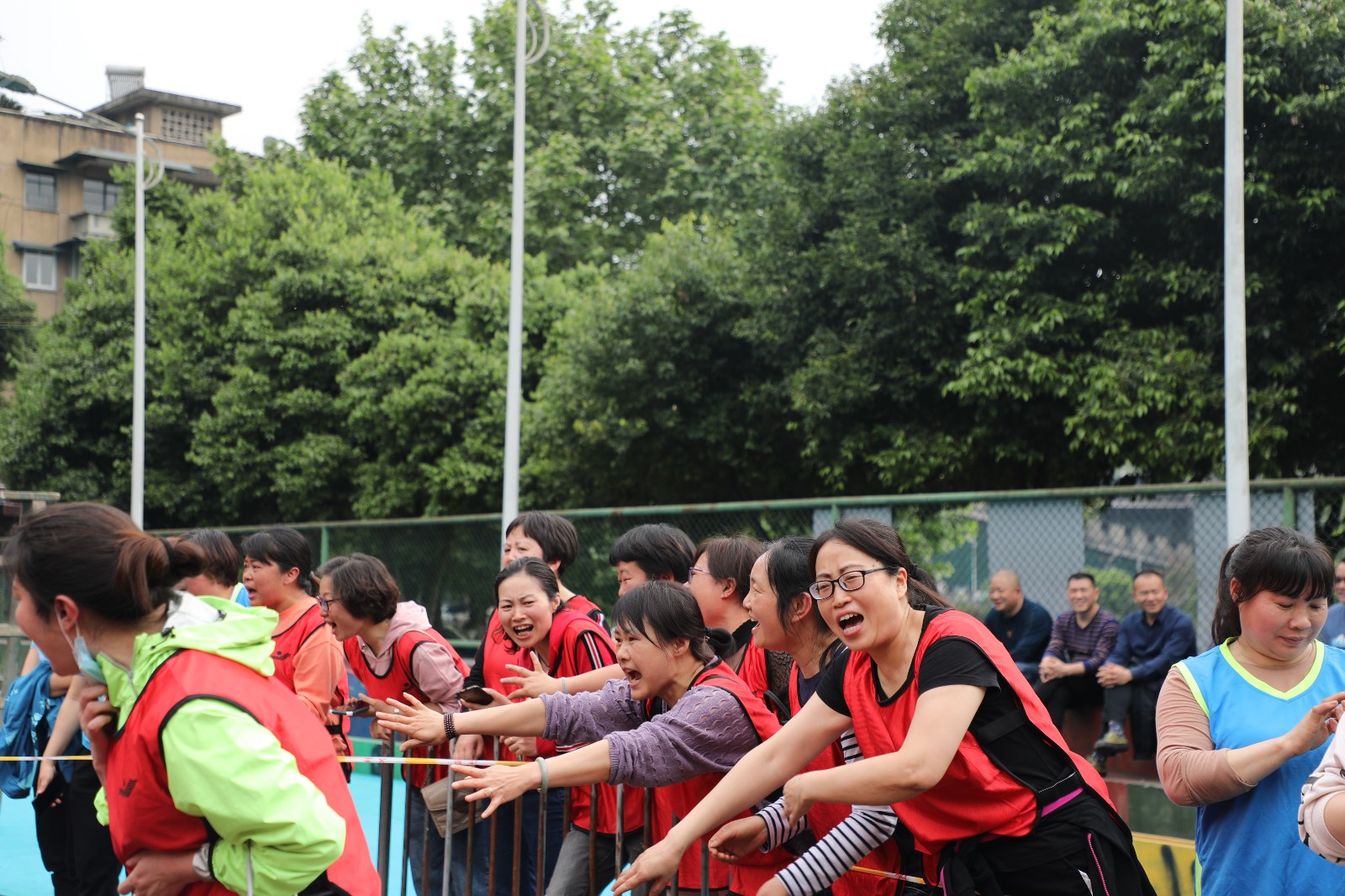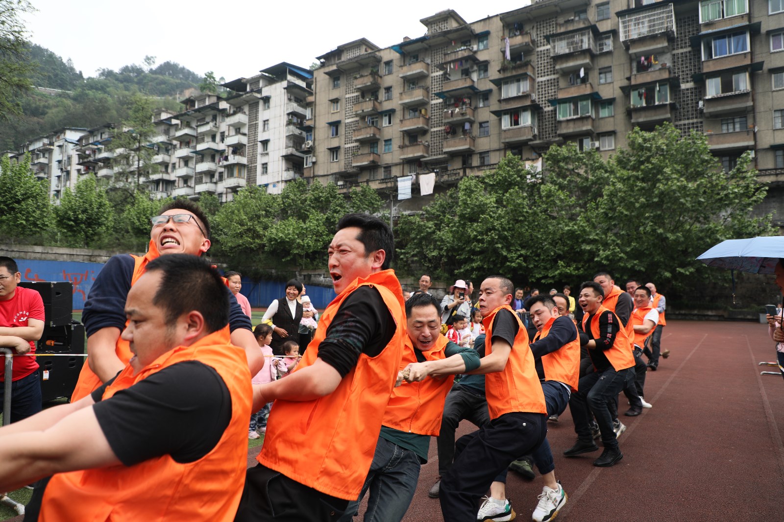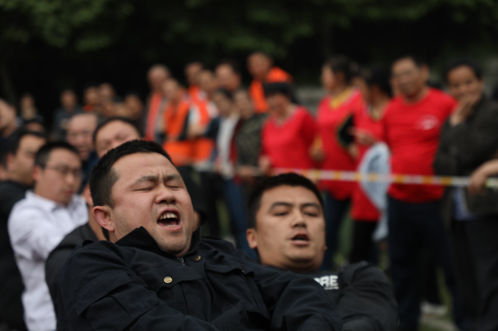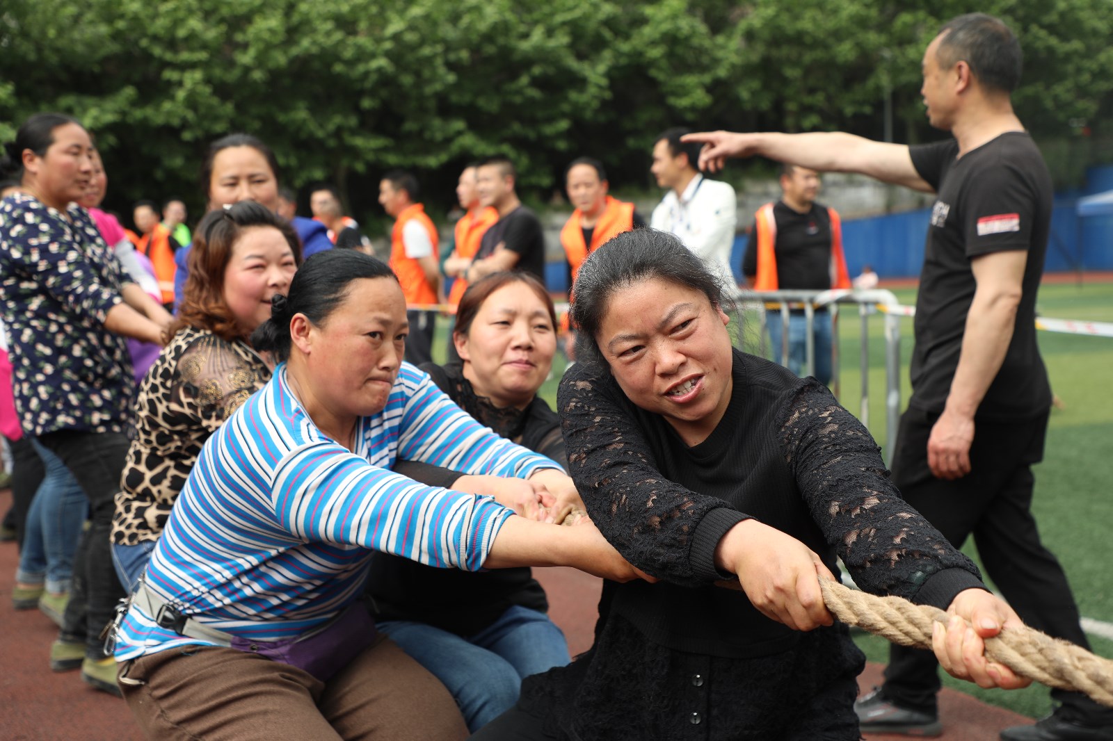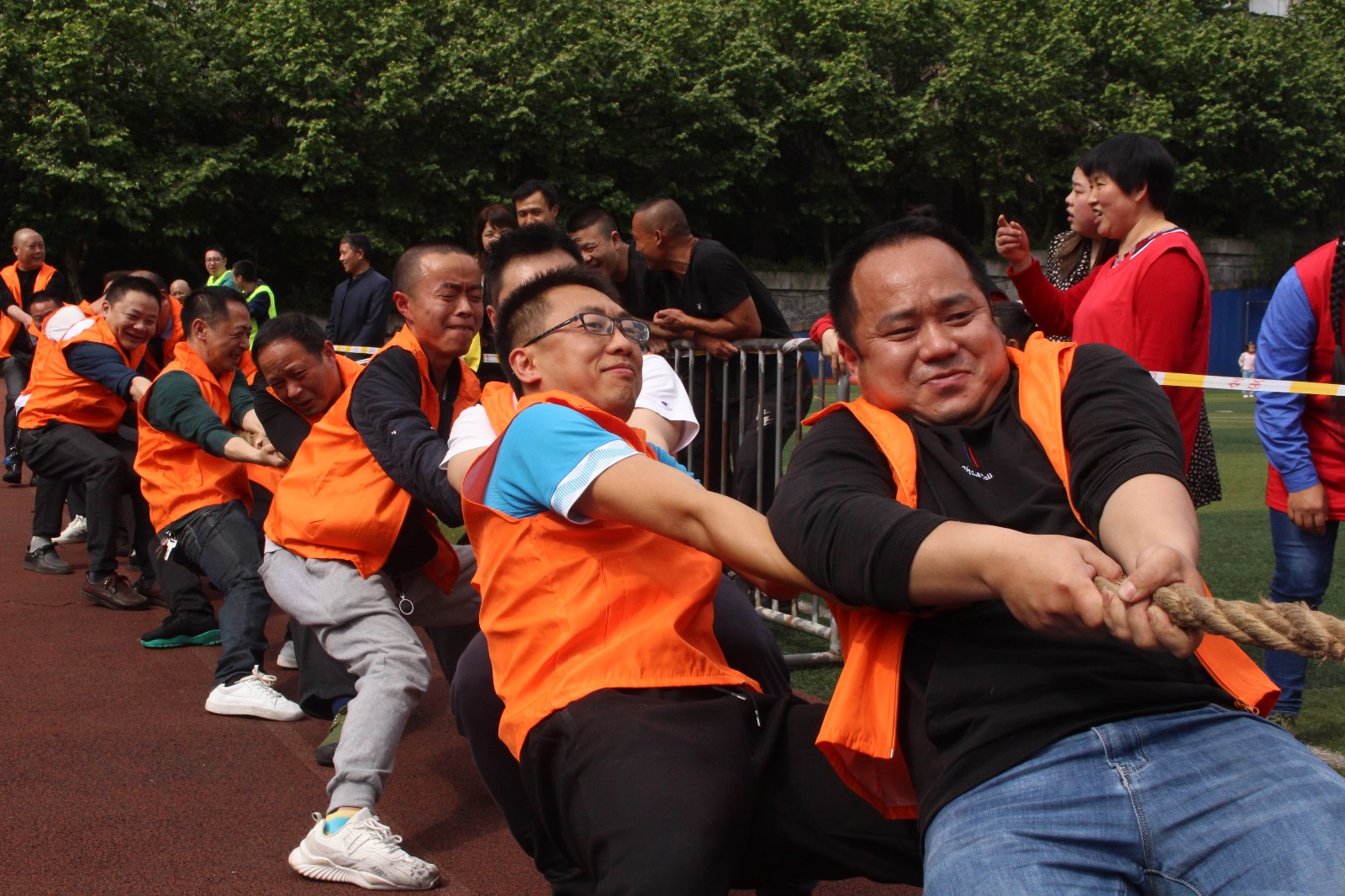 拔河比赛是公司传统体育项目,是一项力量与智慧、耐力和勇气的比赛,职工喜闻乐见,参与度高。参赛男子组8个队,女子组5个队。今年采用全新赛制,男子组第一轮采用分组单循环赛制,第二轮则为交叉比赛。女子组采用单循环赛制。比赛尚未开始,双方就已进入“战斗”状态,双手紧握绳子,双脚用力着地,身体向后微倾,随着哨声一响,双方队员们立即使出浑身解数,铆足了劲,拼尽全力往后拉,两眼直盯赛绳上系的红陀螺,憋得满脸通红......这已不是一场简单的战队实力之间的较量,参赛队员们通力合作,齐心协力,个个精神抖擞、斗志昂扬,拉拉队员和观众们心潮澎湃,情绪激扬的助威呐喊将拔河比赛推向了高潮。