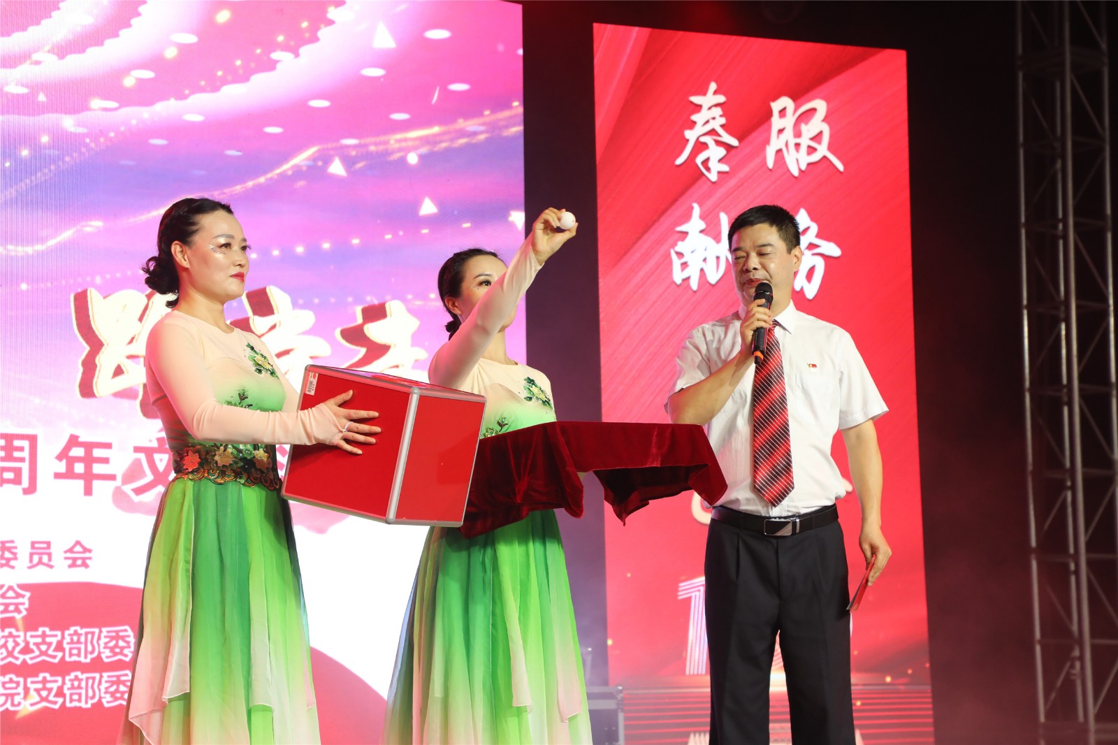 晚会还穿插了幸运抽奖环节,充满了浓浓的喜庆气氛。两小时的精彩汇演在大合唱《没有共产党就没有新中国》的歌声中落下帷幕,大家满怀激情,带着对中国共产党深沉的爱和对祖国的真挚祝福,为建党100周年献礼。