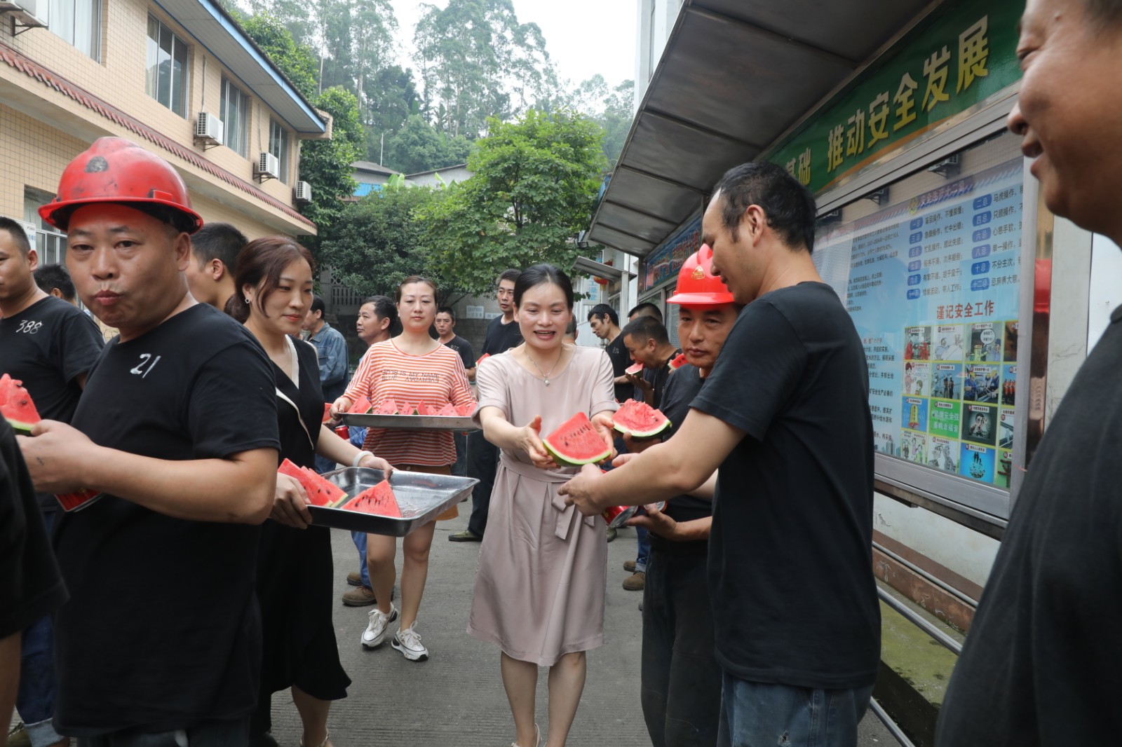 炎炎夏季,骄阳似火,酷热难耐,玩球通中国有限公司官网职工依然坚守岗位,用他们的汗水为企业发展、社会需求贡献着自己的力量。“大兄弟,来,吃一块西瓜凉快凉快”,在玩球通中国有限公司官网井口,乐山市总工会党组成员、机关党委书记张慧一边招呼着矿工兄弟,一边把一块块切好的西瓜送到矿工们的手中;市总工会组宣部部长鲍学智,主任科员张海滨也忙着将一瓶瓶消暑饮料递到职工们的手上,叮嘱大家在确保安全生产的同时不忘防暑降温,丝丝关爱源源流进职工们的心田。